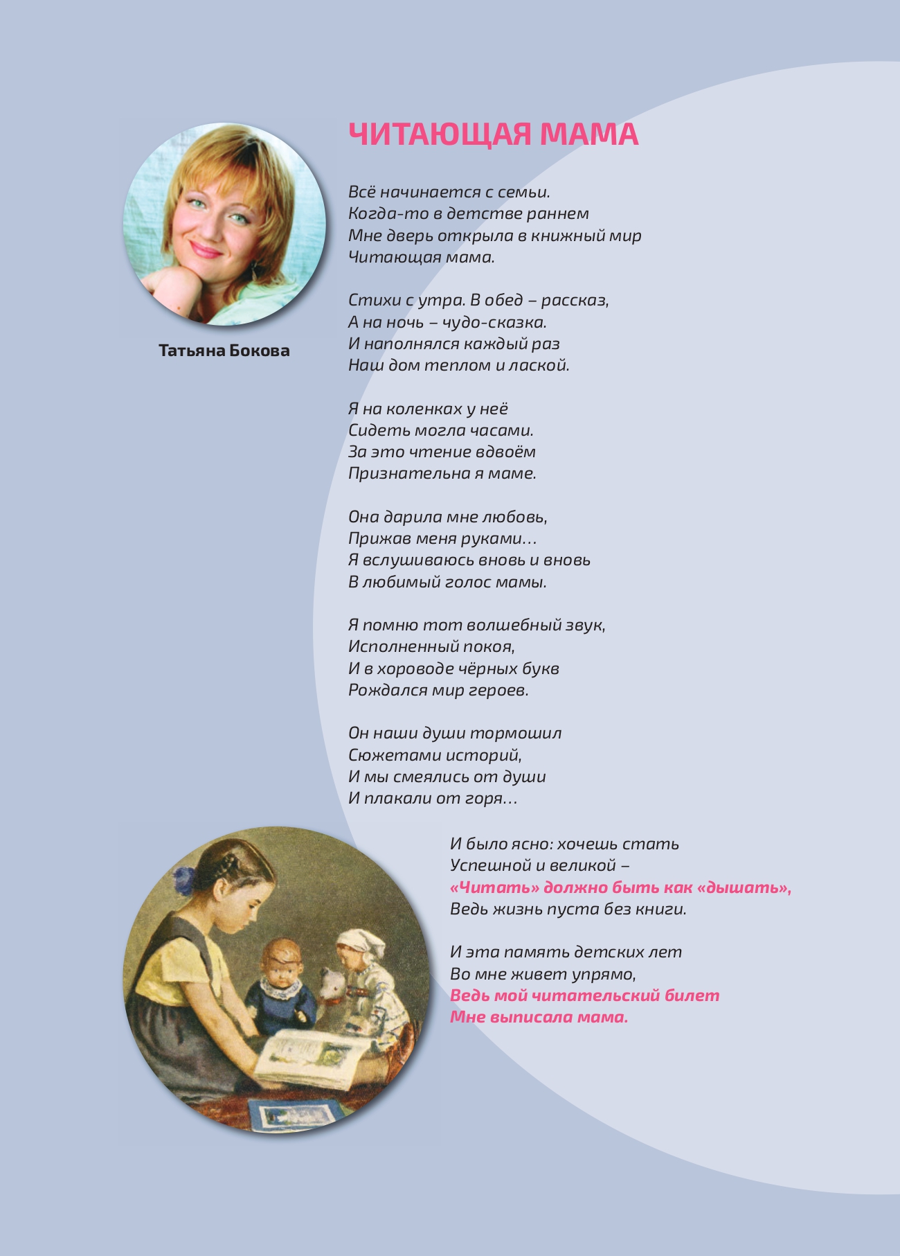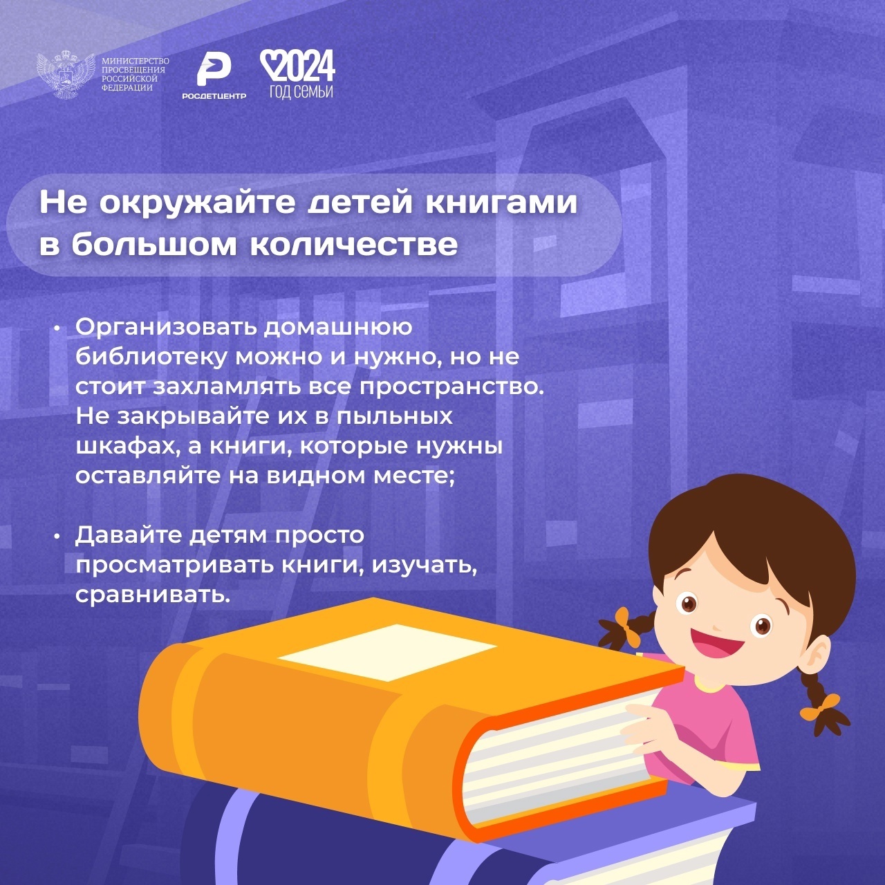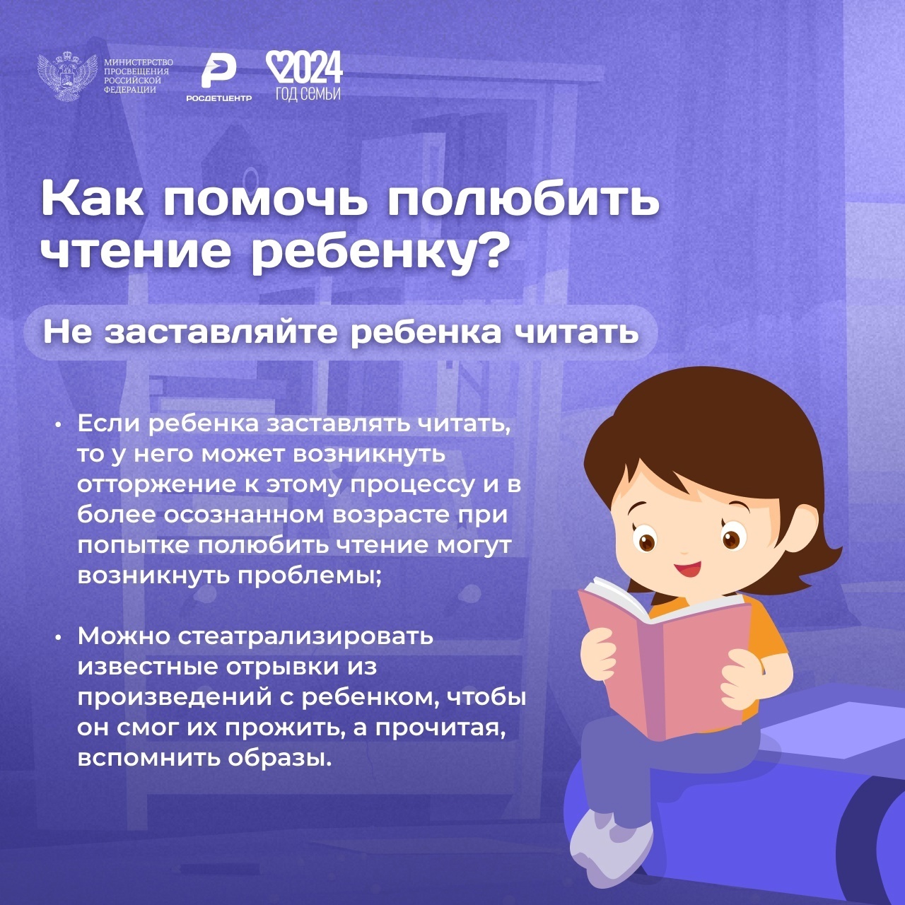 В России 2024 год объявлен Годом семьи в целях популяризации государственной политики в области защиты семьи и сохранения традиционных ценностей. Одной из активностей, призванных решить эти задачи, стал проект «Читающая мама», поддержанный Российским книжным союзом и Русской школьной библиотечной ассоциацией. Его главная цель — восстановить традицию семейного чтения и дать родителям практические инструменты, направленные на развитие и воспитание детей.