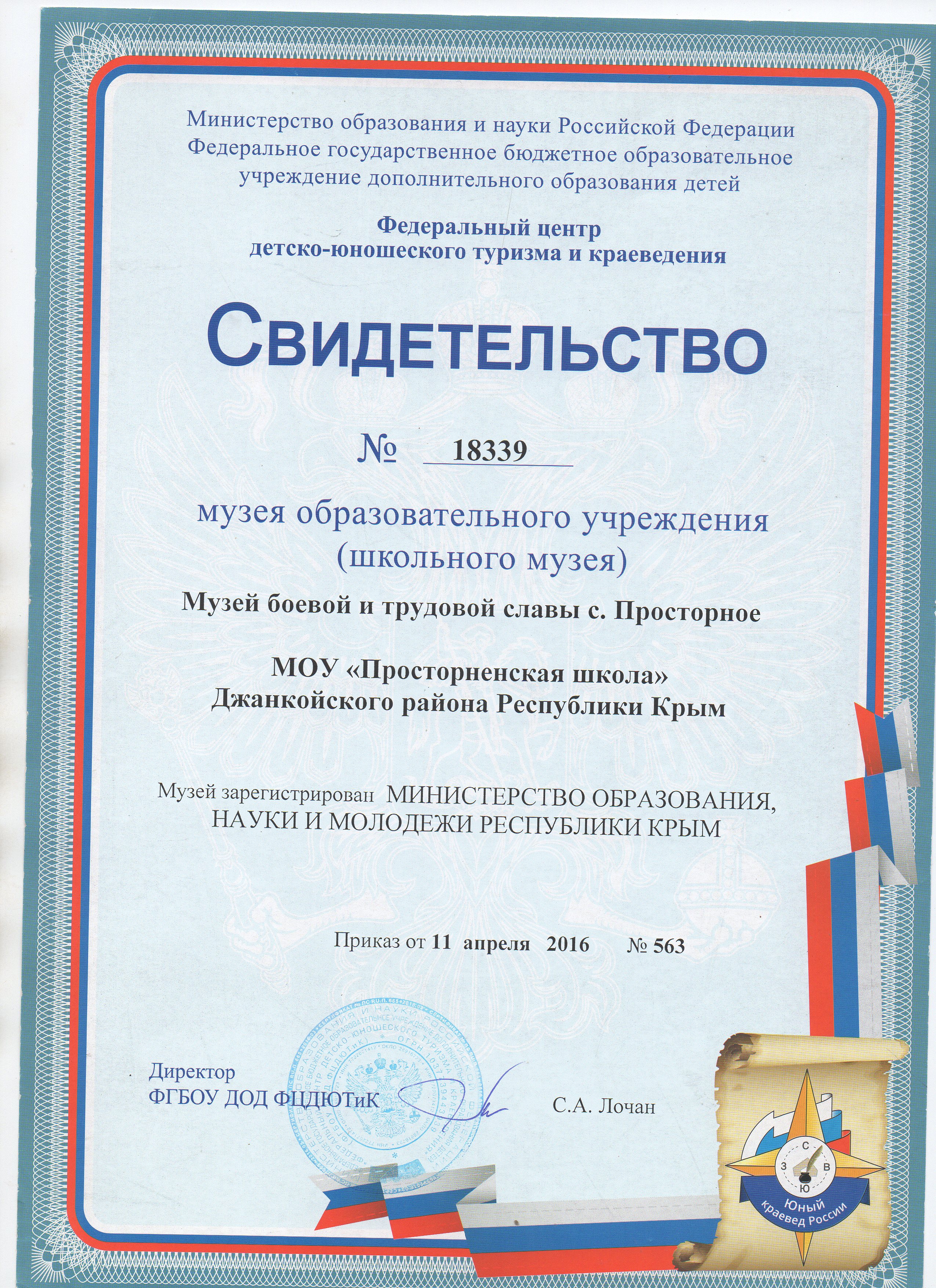 Приказ Минобразования Крыма от 11.04.2016 №563 "Об итогах проведения республиканского этапа паспортизации (регистрации) музеев образовательных учреждений Республики Крым"